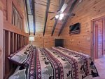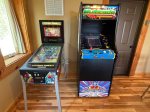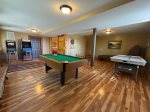 Indoors: Three bedroom, two bath - sleeps up to eight with 2 king beds, twin bunk bed set, and sleeper sofa. Open concept living areas. Great room features custom rocked gas log fireplace, luxury furniture, flat screen television with satellite service. Fully stocked kitchen with separate dining area. On main floor there are two bedrooms, bath with tub/shower combo, and laundry area. Upstairs is master suite with king sized bed, flat screen with satellite, separate sitting area in loft, and private bath. Basement area features two additional living spaces with a pool table, video arcade machine (60 classic games), skee ball game, At Games Legends pinball machine, and a dart board and 70' UHD Smart TV. The cabin also features a kids' table and chairs, pack'n play, and a child's booster seat, as well as new unlimited internet service through out.