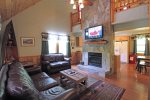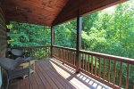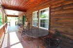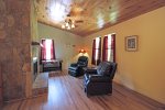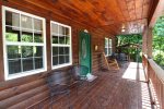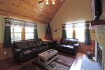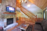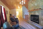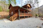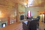 Dream Cabin is a private two bedroom, two bath log cabin that sleeps up to six guests. This lovely cabin greets you with an expansive covered porch, ample parking, and a peaceful quiet that just begs you to sit a spell on the porch. Inside, Dream Cabin is well appointed with nice furnishings, rocked floor to ceiling gas log fireplace, large flat screen television streaming services and a nice open floor plan which provides the perfect atmosphere for enjoying time together as a family or friends. The kitchen is large and fully stocked with everything you need to make a meal right at the comfort of your cabin. If you'd rather take advantage of the gas grill. The downstairs bedroom is equipped with a queen sized bed and nice closet space. The bath is convenient for all guests, with a tub/shower combo. Upstairs, you will find another small living area with two comfortable leather recliners and an electric fireplace. The master is located on this level with a king sized bed and private balcony. The master bath features a tiled walk in shower and double sink vanity. For guest's convenience, there is a washer and dryer, wireless internet, and a landline phone. Newly added hot tub to the outside area and a new outdoor fire pit.