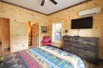 Huggie Bear is a beautifully decorated one bedroom, one bath terrace level log cabin in the Bryson Village Community. This lovely cabin features a nice covered patio with views of the community pond, and an indoor whirlpool tub.