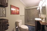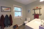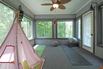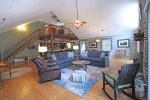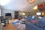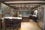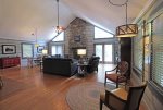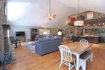 Indoors is just as beautiful and has been lovingly decorated to feature the beauty of the mountains. The living area boasts a large, rocked gas log fireplace, comfortable seating, reading nook, and flat screen tv with satellite streaming, sound bar, and Xbox 360. The kitchen is fully stocked with stainless appliances, quartz countertops, and ample dining space with large dining table and eat in bar. Just off the dining area on the porch is a gas grill and outdoor dining space where you can enjoy a nice meal outside. Also located off the kitchen is a sunroom, which is set up as a yoga/exercise room/play area. On the main floor are two separate bedrooms, one features a full sized bed, the other is set up as a family room with queen sized bed and a connected space with two twin sized beds. Upstairs you will find an open loft set up as a work or lounge space and the private master suite. This lovely room features a queen sized bed, private balcony, and master bath with walk-in tiled shower. An additional space for entertainment can be found in the basement. Here you will find a ping pong table and outdoor equipment for guest enjoyment.