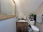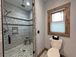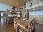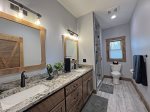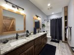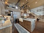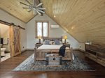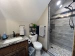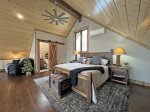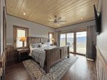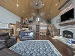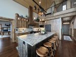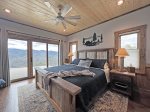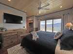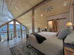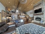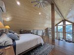 No need to worry, the views at this home can be enjoyed both indoors and out. There are large windows throughout the home to fully embrace the mountains wherever you decide to relax. The interior of the home is simply stunning with it's custom touches and luxury decor, the owner's equipped this home with love and care. The main floor of the home boats a nice open floor plan with cathedral ceilings and floor to ceiling windows. The living room area has comfortable leather ceiling, custom made cedar end tables, rocked wood burning fireplace, and large smart tv with satellite service. The fully stocked kitchen with custom made cabinets and leathered granite is fully stocked with everything you'd need to cook a meal right at the cabin to enjoy. There is also a large dining table and eat in bar, perfect for gathering and enjoying each other's company after a long day of exploring. The two dual master bedrooms are located on each floor, each equipped with king sized beds, flat screen tvs, closet and dresser space for storage, and ensuite baths - one features a walk-in tiled shower, the other a tub/shower combo. Both bedrooms have doors that lead right out to the porch to enjoy a morning cup of coffee or the crisp evening mountain air. Upstairs there is an addition bedroom in the open loft that features a king sized bed, ensuite bath with tiled shower, reading nook, and likely the best view in the house from the living room windows.