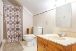 You will further appreciate this home away from home once you step inside. The open floor plan, fully stocked kitchen, dining space, and living room area make it the ideal vacation home for families or large groups. There are two master bedrooms located downstairs, each with an inviting king sized bed. The downstairs bath is located between each bedroom and features a tub/shower combo. Upstairs you will find two additional bedrooms, the first with another king sized bed and the second with a full size bed. A “game night” space separates the two bedrooms and contains both a foosball game and table with chairs perfect for card/board games and puzzles. The convenient upstairs bath is equipped with a walk-in shower. Each bedroom is cooled by its own window unit a/c. For guest convenience, a washer/dryer are located on the porch in a separate enclosed area.