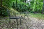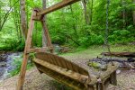 As you enter the driveway to Larky Lodge, you will immediately notice the quaint mountain charm this home possesses and may never want to leave! There is a charcoal grill and picnic area alongside the creek which are perfect for a delicious meal by the water. The backyard is also complete with a spacious fire pit area and picnic table.