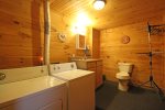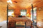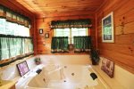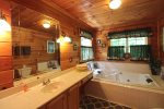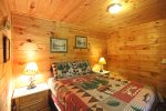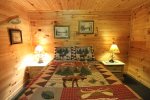There is a rustic style bedroom on the main floor with queen-sized bed. Bathroom with shower is located on main floor as well to be convenient for all guests. Master bedroom is located in the loft with a King Size bed, master bath featuring double sinks and whirlpool tub. One additional bedroom downstairs with a queen, and a bonus room with a queen. Smoky Mountain Paradise also offers WiFi for guest usage.