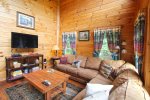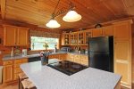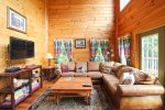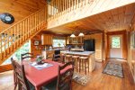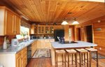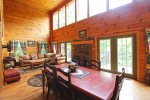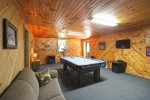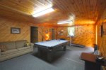 If you want to just enjoy your cabin, there is plenty of amenities to suit your family. The nice deck outside offers outdoor dining, hot tub, and a lovely mountain view. The large windows and cathedral ceilings help bring the light and beauty in from the outdoors. The large fully stocked kitchen offers plenty of room for your family or group to dine together, or relax in the cozy great room. Downstairs offers a game room with a pool table.