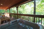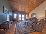 Thinking of just hanging around the cabin and relaxing, well this is the right spot for you! Trail's End offers peace, serenity, and entertainment in every corner. Take in the peaceful outdoor setting for the comfort of your large covered deck with porch chairs, , or make a nice meal outdoors on the gas grill with outdoor dining. Indoors in just as lovely in this mountain retreat. The open floor plan leaves the cabin feeling airy, spacious, and inviting. The living area is equipped with high end furniture with power recliners and charging ports, electric fireplace, Smart TV with Streaming Services, DVD player, & wireless internet. Open to the living area, you will find the full kitchen which has all the utensils and cookware you need to make a nice meal at the cabin. Perfect entertainment for it's guests. The master suite offers a king sized bed, television, and private bath. The second bedroom has a queen. What are you waiting for, this cabin has everything you need and more!
